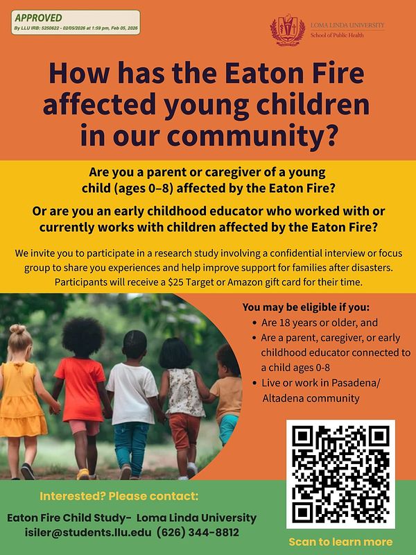 I am currently a doctoral student in Public Health at Loma Linda University, and my research focuses on how the Eaton Fire has affected children ages 0–8 and the caregivers and educators who support them. As both a mother and a lifelong community member, I care deeply about how our children are experiencing this moment and how we can support one another as we heal and move forward together.